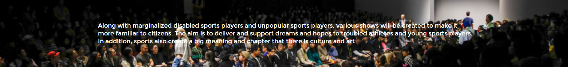 비인기종목과 장애인 청소년들의 자긍심 고취 및 미래의 주역으로서 꿈과 끼를 펼칠 수 있는 기회 제공과 스포츠 문화 정착을 위한 프로그램 개발의 초석을 삼고자 무대행사 등 각종 문화행사를 개최하여 시민들과 함께 함.